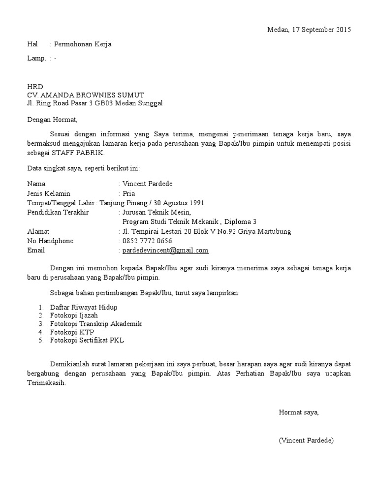 Contoh Surat Lamaran Kerja di Pabrik Kelapa Sawit Yang Benar from marketmedan.com Maybe you would like to learn more about one of these? We did not find results for: Check spelling or type a new query. Kumpulan contoh surat lamaran kerja di pabrik kebun sawit.